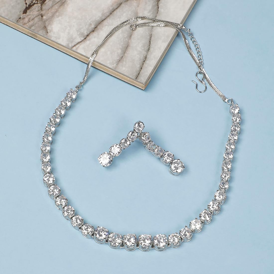 A sophisticated pairing featuring a graduated brilliant-cut stone necklace and matching linear drop earrings. This set blends a sleek, flat-snake chain with a radiant focal arc, mimicking the fire of fine diamonds in a modern, lightweight design.